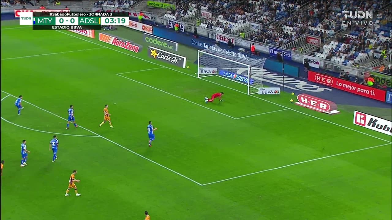 Tiro atajado junto al lado derecho de la portería. Vitinho (Atlético San Luis) zurdazo desde fuera del área. Asistencia de Ricardo Chávez.