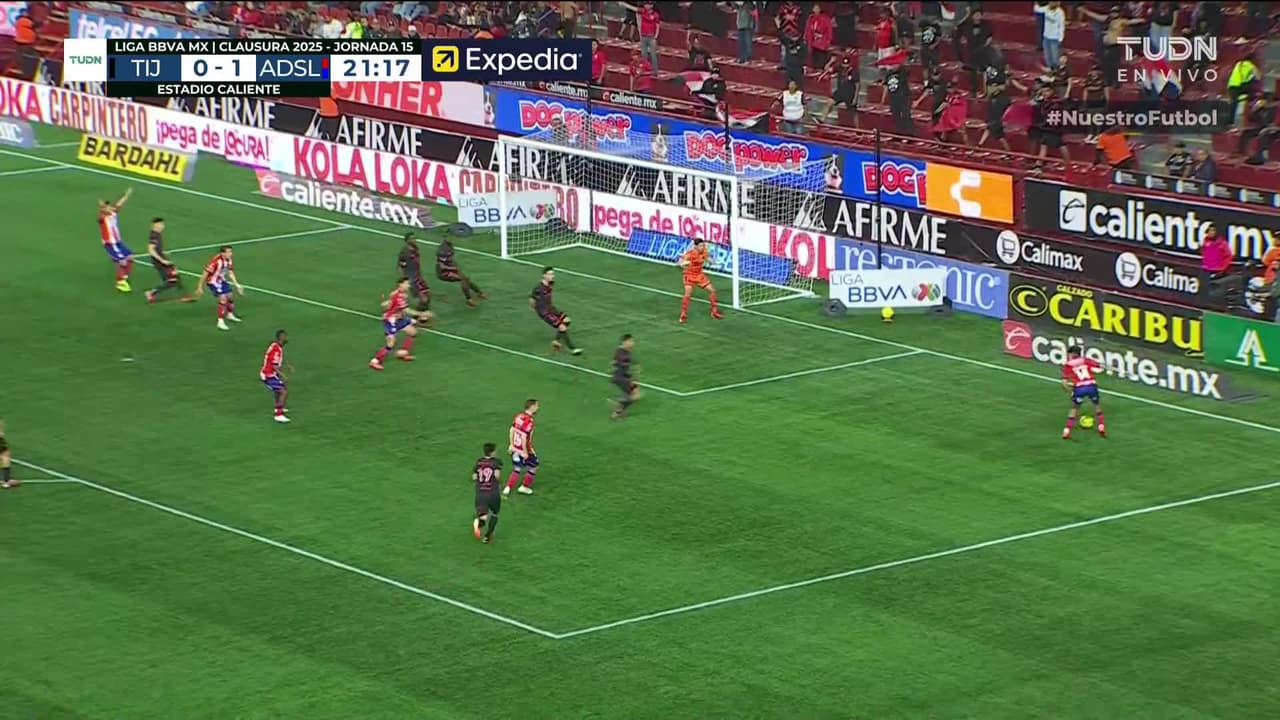 Tiro atajado raso al centro del arco. Vitinho (Atlético San Luis) zurdazo desde el centro del área.
