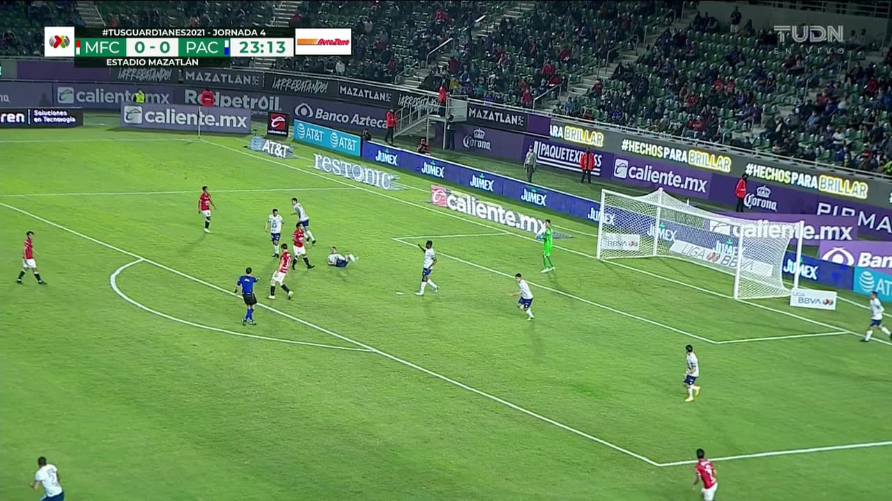 Tiro atajado Por arriba en el centro del arco. Gael Sandoval (Mazatlán FC) disparo de cabeza desde el centro del área. Asistencia de Mario Osuna con un centro al área.