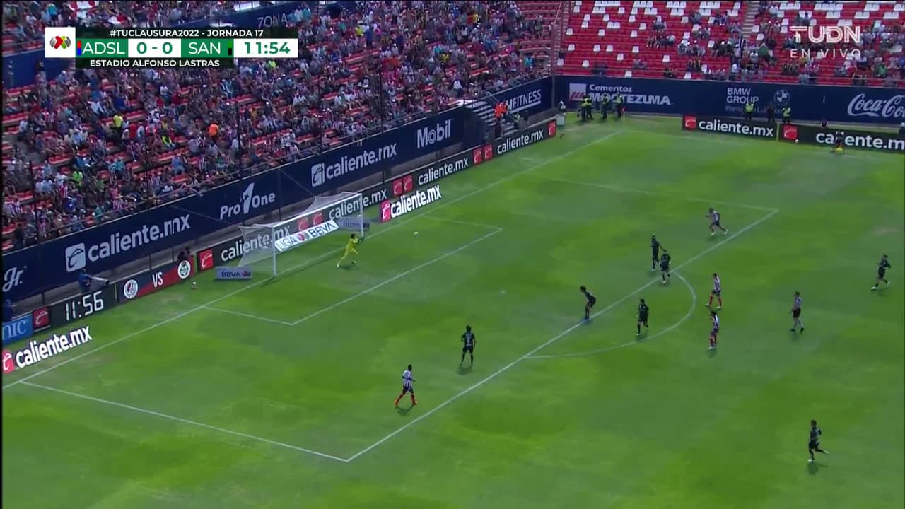Tiro atajado raso al centro del arco. Zahid Muñoz (Atlético San Luis) Disparo con la derecha desde fuera del área. Asistencia de Germán Berterame.