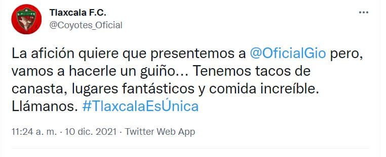 "La afición quiere que presentemos a Giovani pero vamos a hacerle un guiño. Tenemos tacos de canasta, lugares fantásticos y comida increíble. Llámanos #TlaxcalaEsÚnica" señala el mensaje en redes sociales.