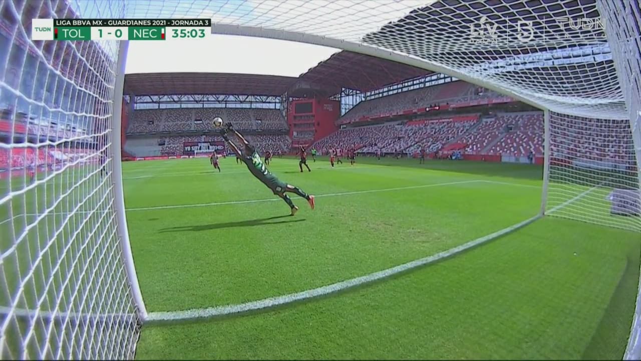 Malagón vuela por todo lo alto y saca el remate de Pedro Canelo en una muestra de calidad del portero de Necaxa.