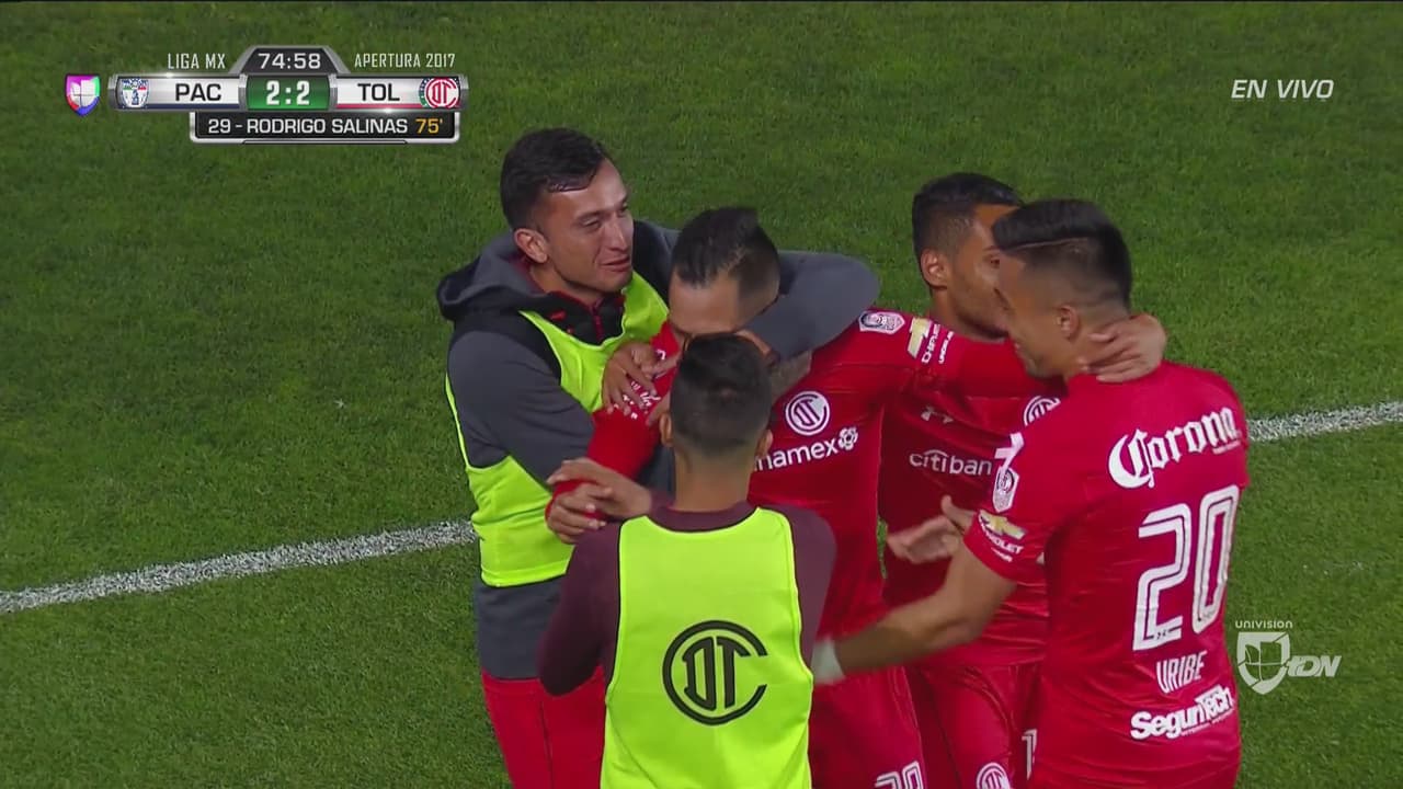 Justo cuando el Pachuca jugaba mejor y ya se estaba saboreando los tres puntos, apareció Rodrigo Salinas en el área, la bajó como crack y definió a segundo poste para el 2-2.