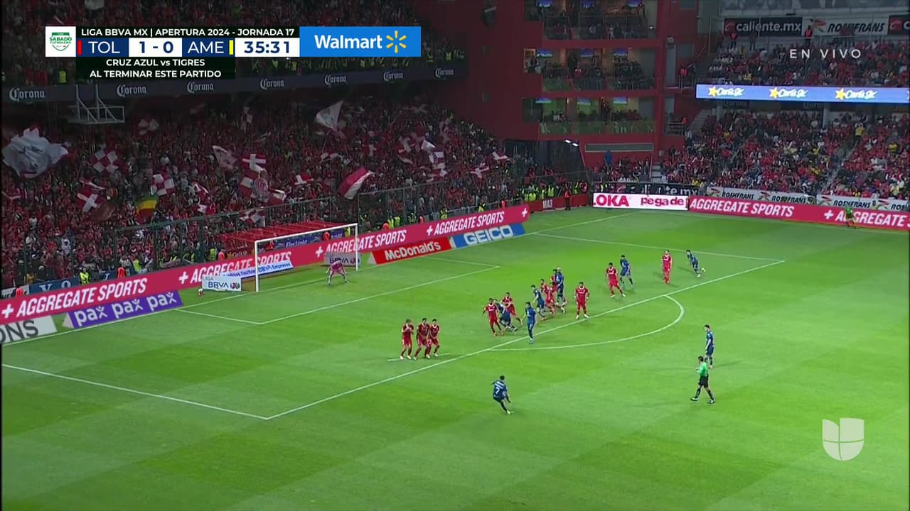 Brian Rodríguez cobra el tiro libre al segundo poste y el portero del Toluca se luce lanzándose a su costado derecho para evitar el empate del América.
