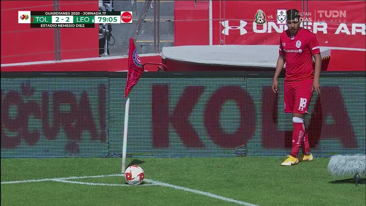 Tiro atajado al ángulo superior derecho. Oscar Ortega (Toluca) disparo de cabeza desde el centro del área. Asistencia de Kevin Castañeda con un centro al área.