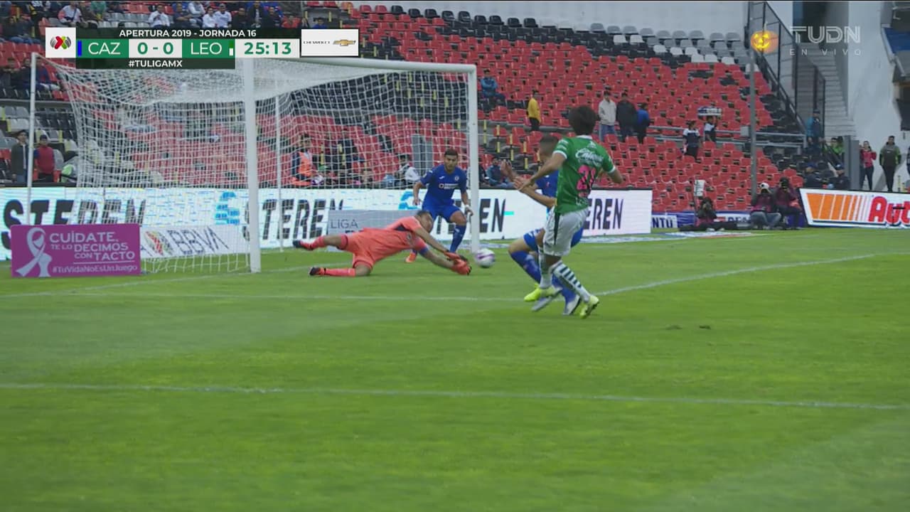 El delantero del León no aprovecha un rechazo de Jesús Corona y su disparo pasa a un lado del poste izquierdo.