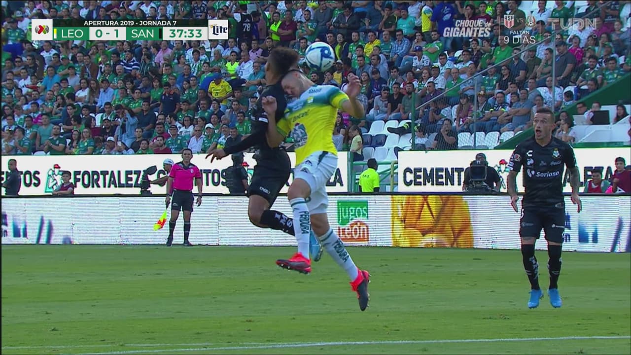 El defensa del León se equivoca en un balón aéreo y propina un fuerte cabezazo al mediocampista de Santos Laguna, la acción termina en amarilla.