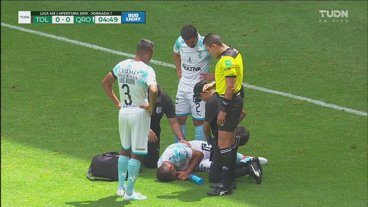 El defensor del Querétaro quedó derribado en el área luego de tener un encontronazo por aire al minuto 5.