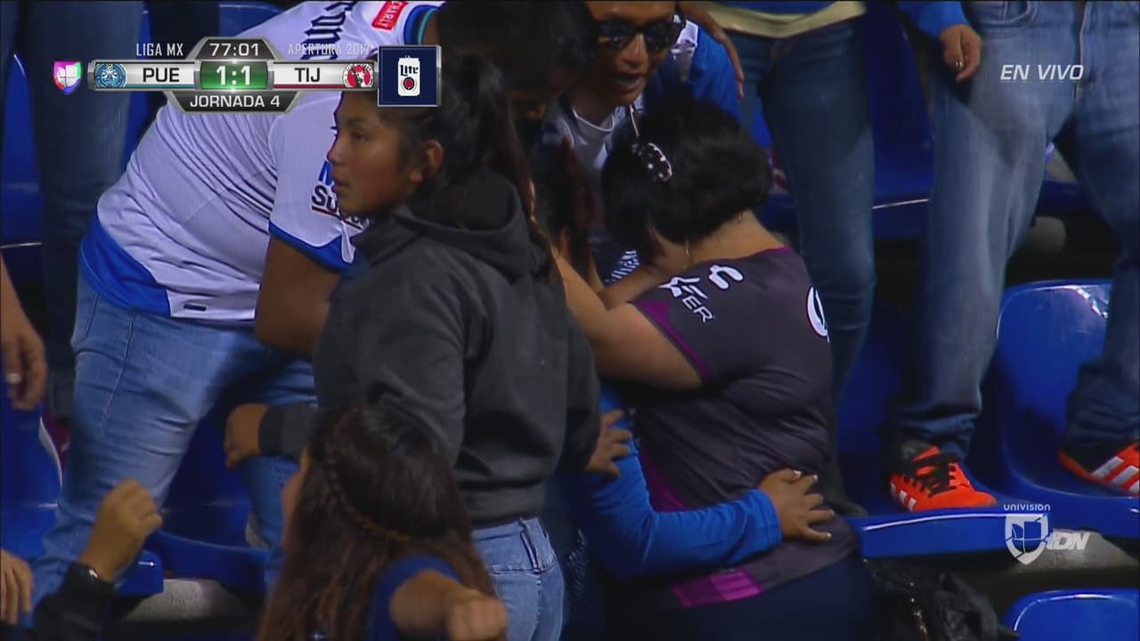 Luego de un intento de gol de Xolos, una señora en la tribuna detrás del arco de Moisés Muñoz se llevó la peor parte.