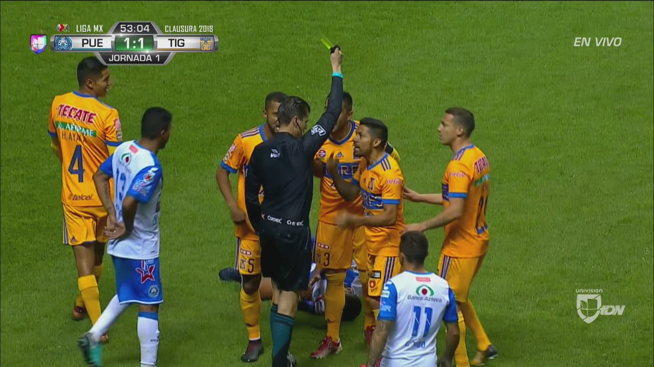 El volante de Tigres levantó de más el brazo y golpeó a un jugador de Puebla, pero el árbitro solo lo sancionó con tarjeta amarilla.