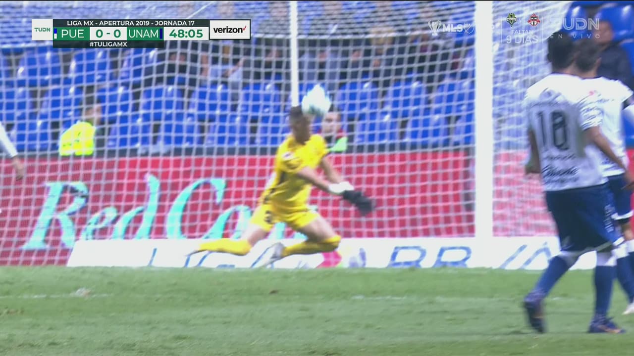 Kevin tomó el balón en tres cuartos de cancha y mandó un potente tiro que el portero del Puebla tuvo que resolver en dos tiempos al 47’.