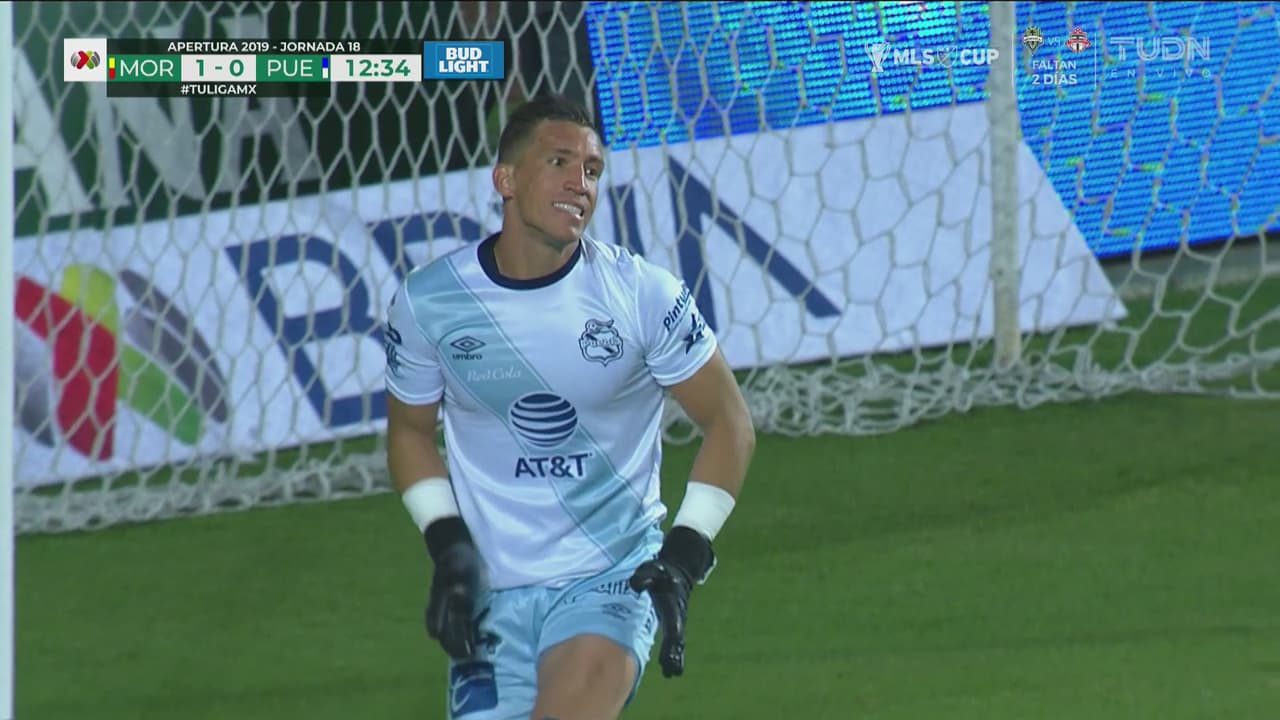 El mediocampista peruano controla el balón en el área, saca un potente disparo y el arquero poblano no se mete en problemas y concede tiro de esquina.