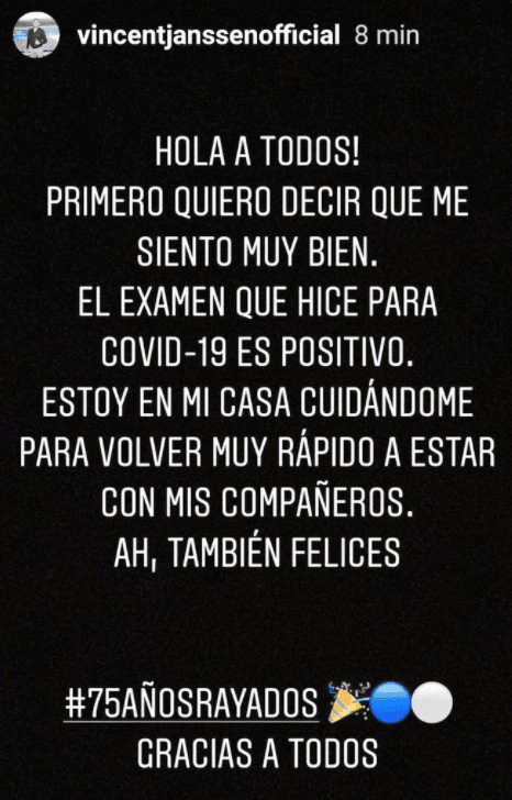 Previamente, el club había dado a conocer que un miembro del equipo tuvo el resultado positivo por coronavirus y el mismo jugador se encargó de anunciar que era él quien salió afectado.