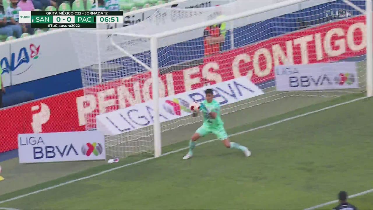 El delantero de Santos se quitó a un zaguero y luego metió tiro-centro que Ustari contuvo al 7’.