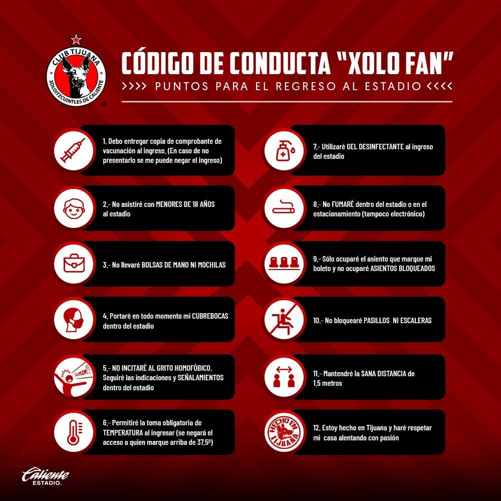 Xolos de Tijuana se pone estricto con el ingreso a su estadio para la afición y ha dado a conocer un “Código de Conducta Xolo Fan” para ingresar al inmueble en el juego contra Puebla y se reservan el acceso a personas vacunadas o mayores de 18 años, entre otros puntos.
