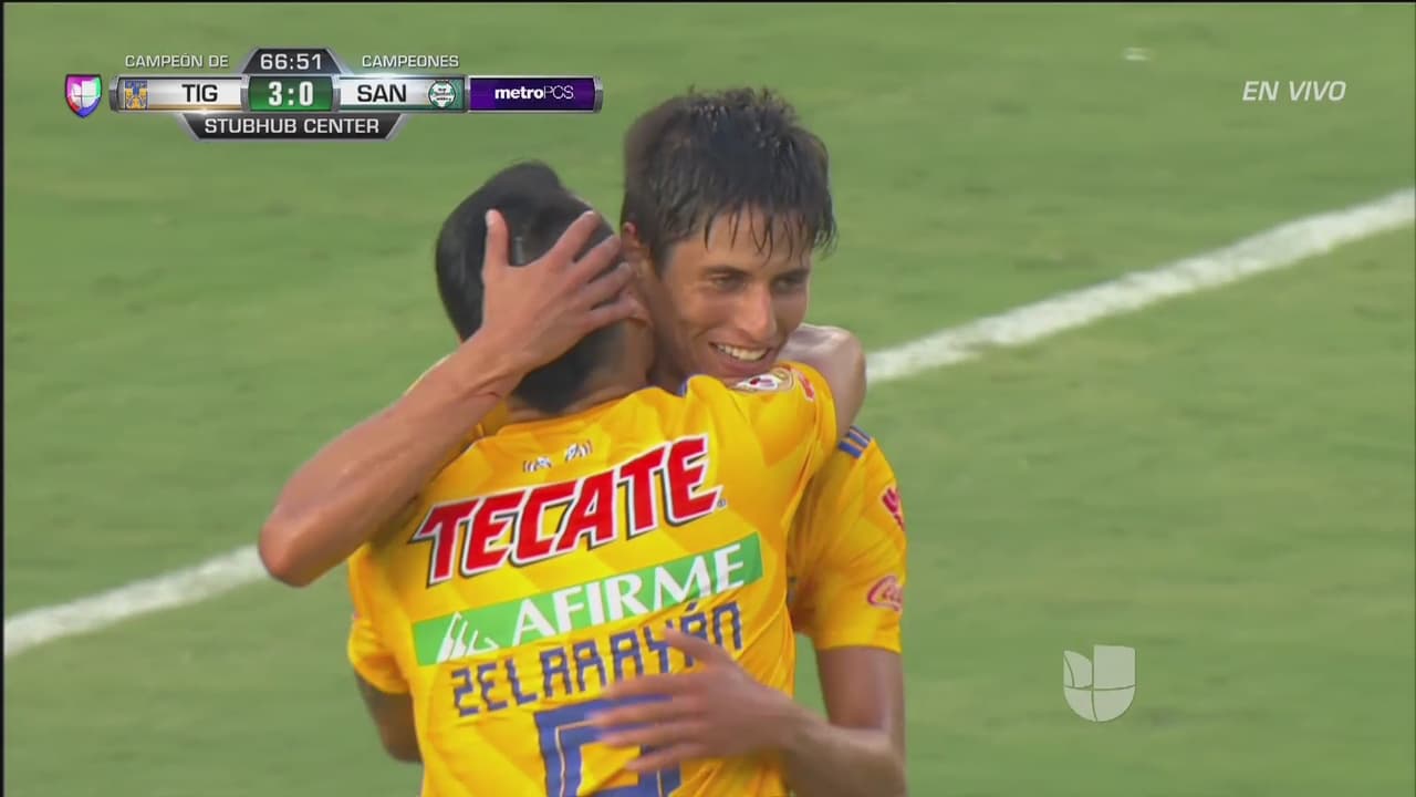 Tras un gran desborde de Jürgen Damm, le pone un balón a modo a Lucas Zelarayán, quien solo empuja el balón a las redes para el 3-0 de Tigres sobre Santos.
