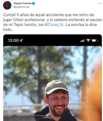 "Cumplí 5 años de aquel accidente que me retiro de jugar fútbol profesional, y lo celebre visitando al equipo de mi Tepic bonito, los @Coras_fc. La sonrisa lo dice todo", comentó.