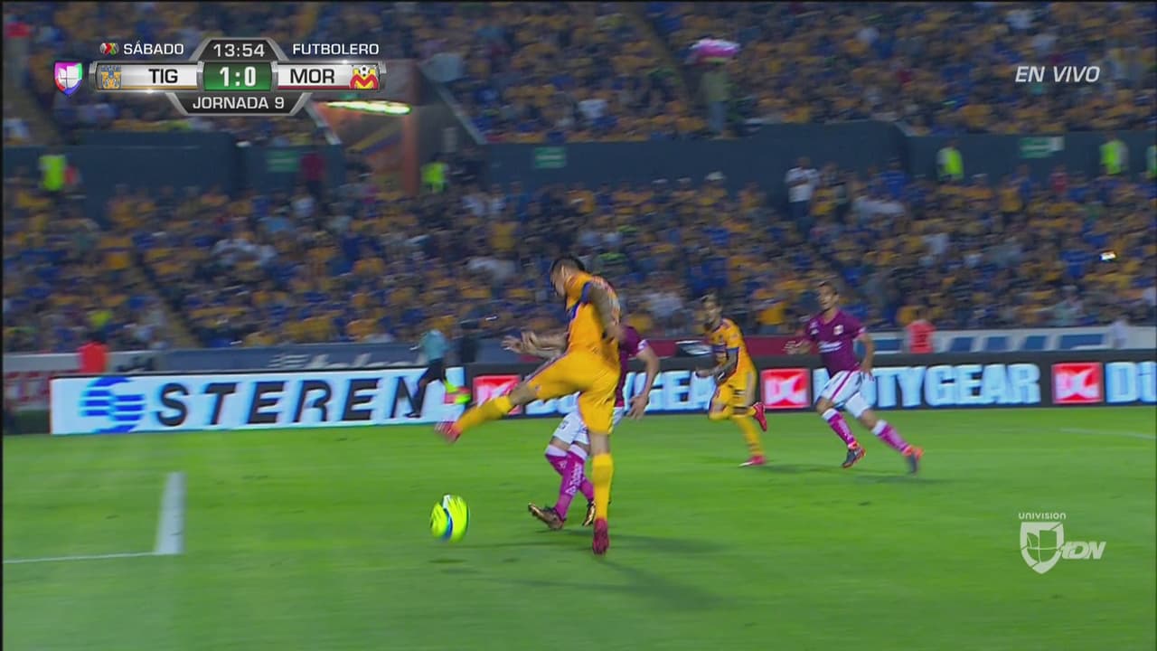El atacante de Tigres intentó una jugada difícil y por muy poco no hizo un tanto a Monarcas.