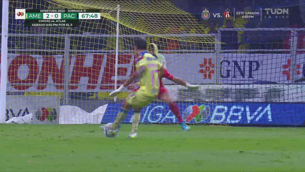 El jugador del América se queda frente al arquero del Pachuca y no fusila, se la deja a un lado para que Moreno la guarde.