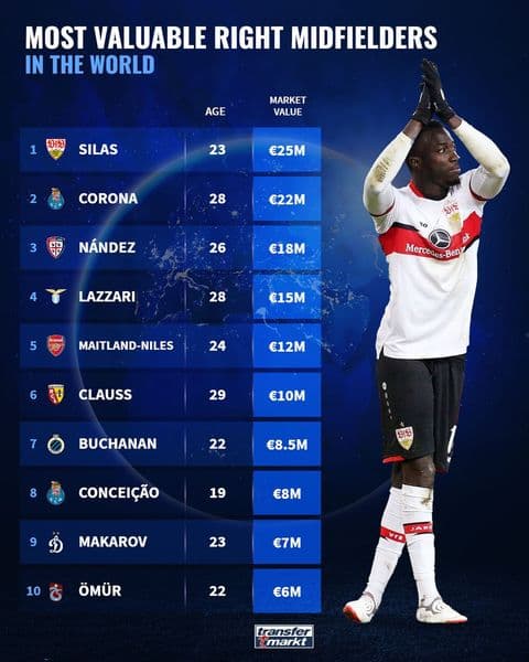 ‘Tecatito’ Corona solo está por debajo de Silas Katompa Mvumpa, jugador congoleño del Stuttgart de la Bundesliga alemana, valuado en 25 millones de euros.
