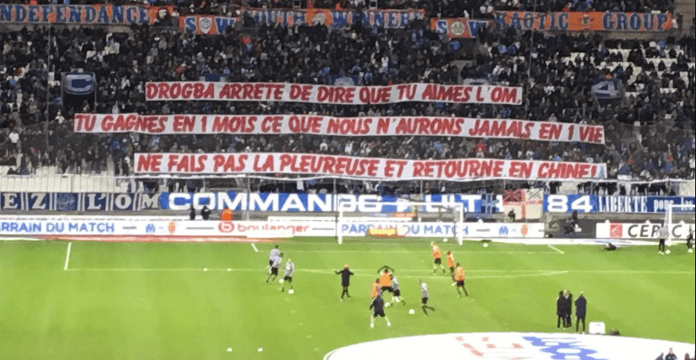 "Drogba, deja de decir que amas al OM. En un mes ganas más de lo que nosotros tendremos en toda una vida. Deja de ser un bebé llorón y devuélvete a China", leía la pancarta que elevaron los seguidores del Olympique, el domingo en el partido ante el Monaco.