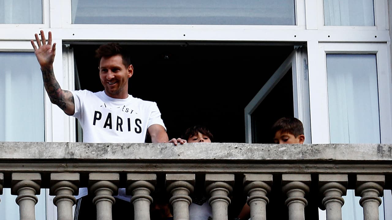 Messi ascendió al piso donde se hospedará y salió al balón para saludar y responder al llamado de sus nuevos seguidores mientras no dejaban de corearlo y vitorearlo como nuevo elemento del PSG.