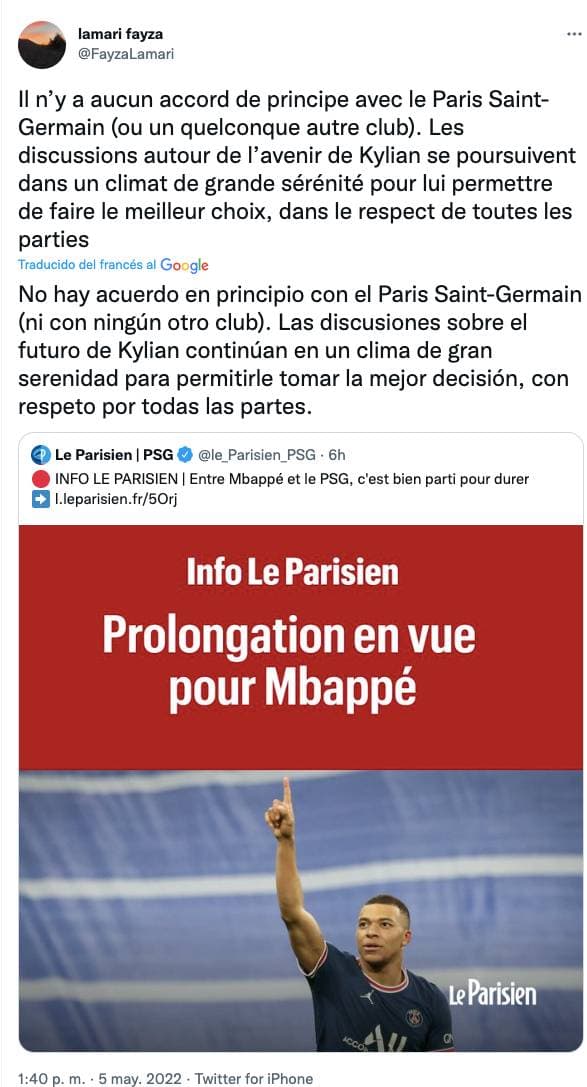 “Las conversaciones sobre el futuro de Kylian continúan en un clima de gran serenidad para permitirle tomar la mejor decisión, en el respeto de todas las partes implicadas", escribió Fayza en su cuenta oficial de Twitter en un mensaje que en minutos se hizo viral.