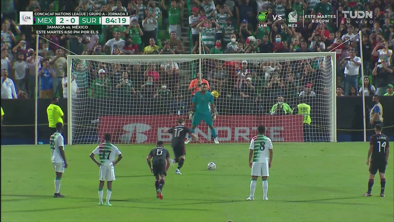 El mexicano pidió la oportunidad y la tira al costado derecho, pero el portero se la tapa.