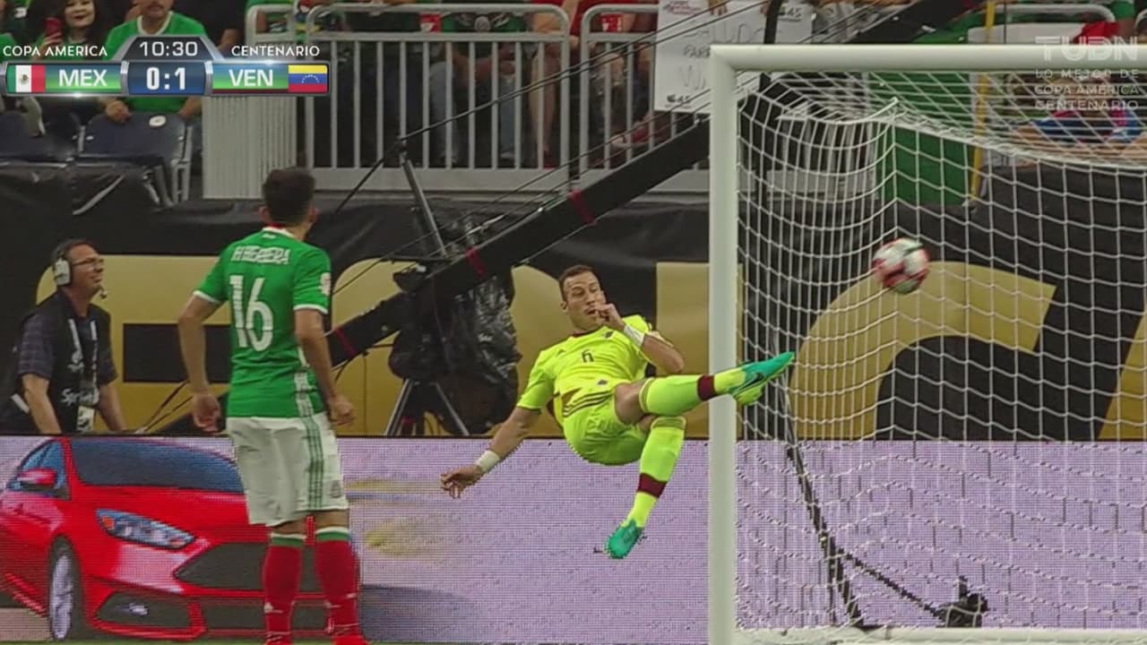 En jugada de táctica fija, el defensa de la Vinotinto quedó solo en el área y con una tremenda tijera fusiló al arquero Jesús Corona.