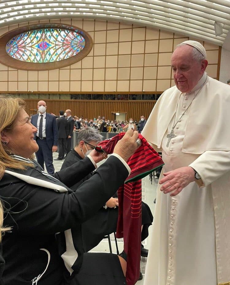 Dolores Aveiro obsequió al papa Francisco una camiseta de la selección lusa con 7 en el Vaticano.