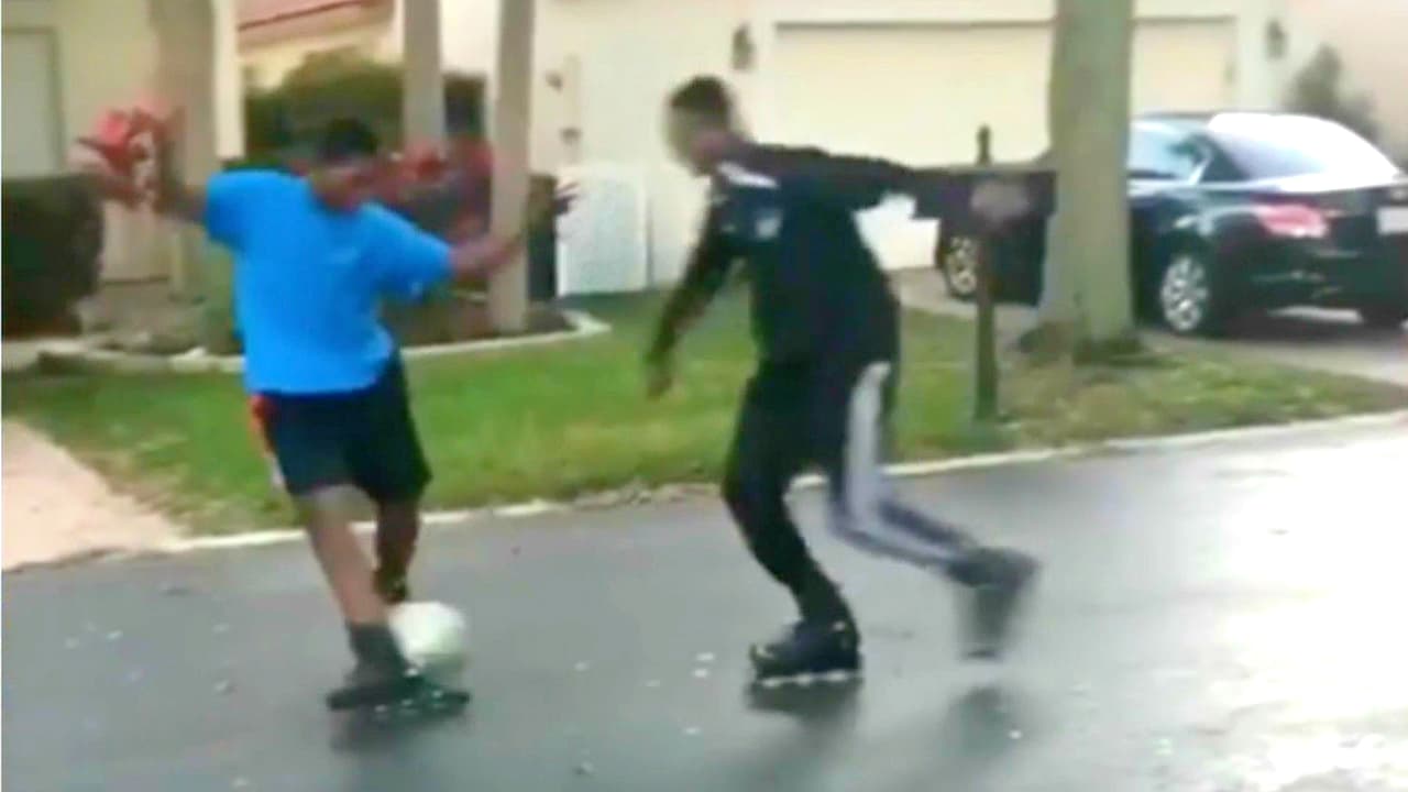 En las calles de una ciudad de Estados Unidos, estos dos jóvenes se arriesgaron a jugar fútbol 'rodando'. Uno encara al otro y lo evade con un impresionante túnel. Aquí el arriesgado instante.