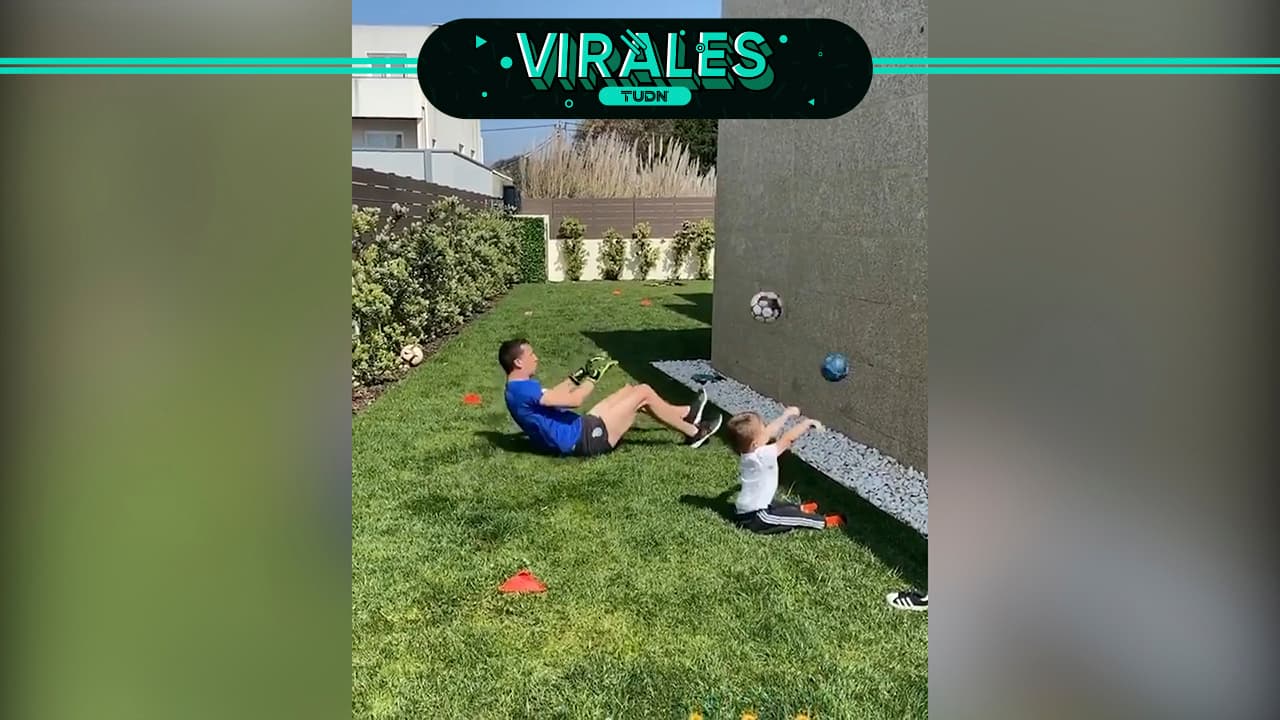 El portero del Porto muestra como se mantiene en forma al lado de su hijo en Portugal.