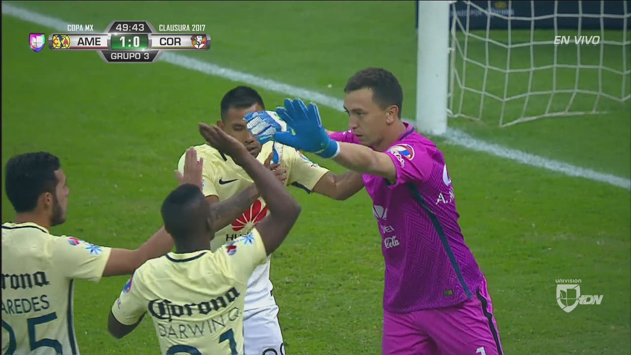 El portero de las Águilas contuvo con la pierna el cobro de Wiliam Guzmán y Coras se perdió el gol del empate en el Azteca.