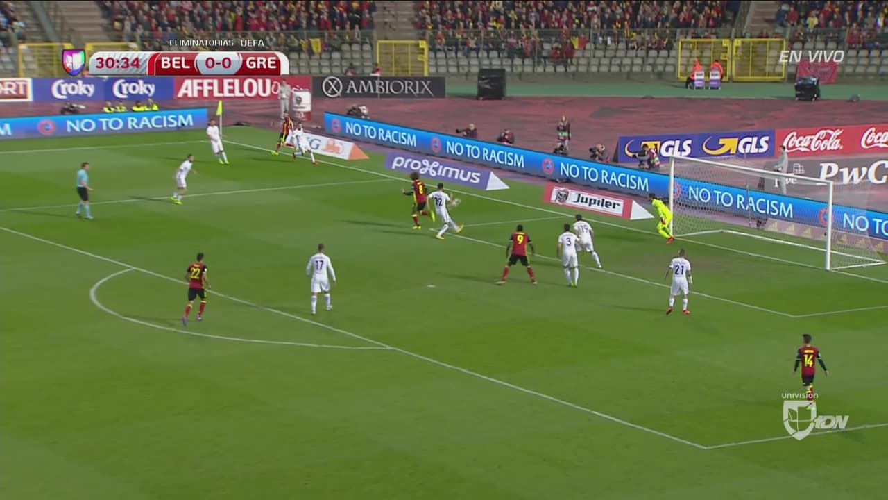 Marouane Fellaini cerca de hacer el gol del año ante Grecia