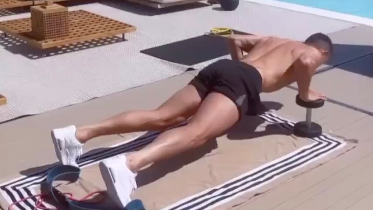 El portugués hace su rutina de ejercicio en el patio de su lujoso nuevo hogar en Lisboa junto a un jacuzzi y una piscina.
