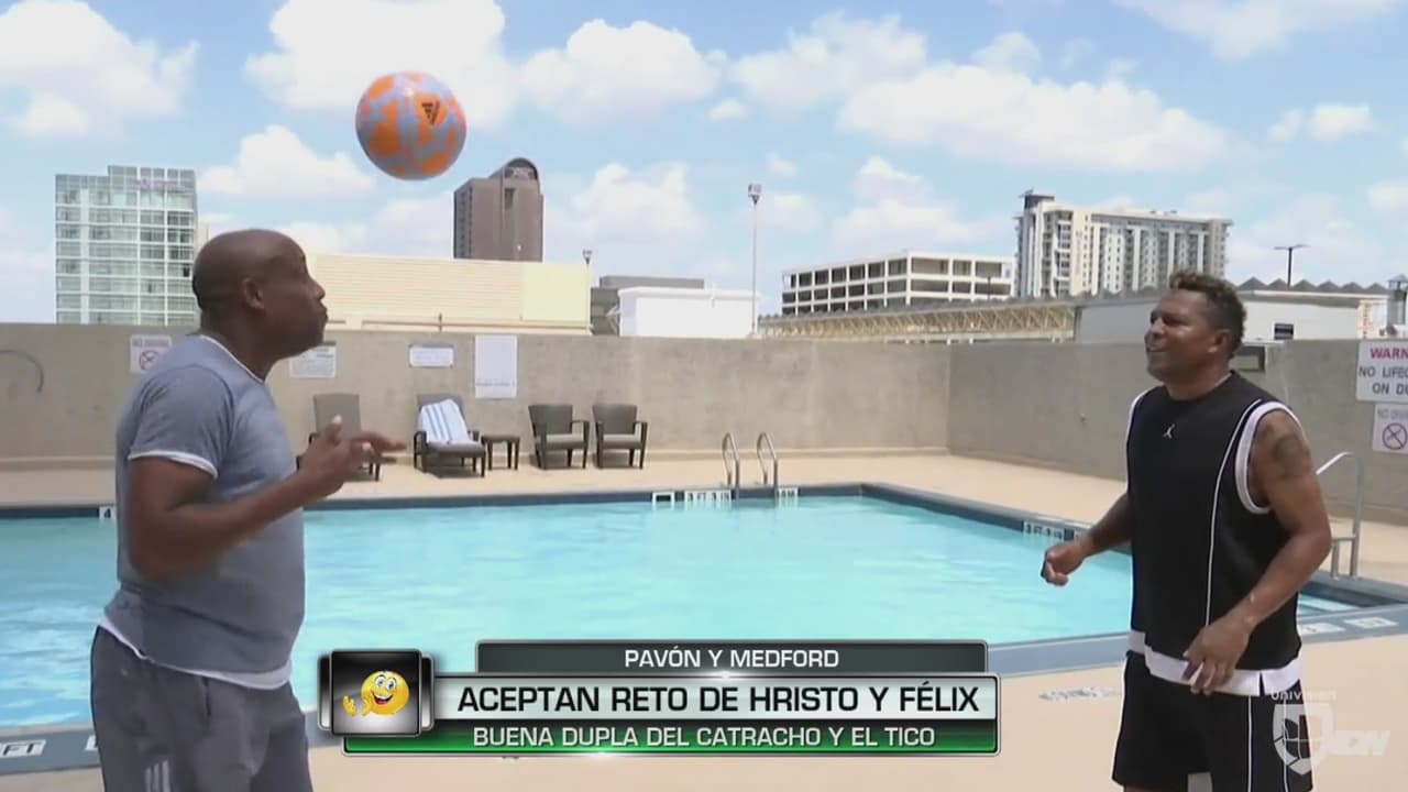 Nuestros talentos invitados aceptaron el desafío de hacer ‘cabecitas’ con el balón sin dejarla caer. La dupla del costarricense y el hondureño demostraron que aún se mantienen en buena forma.