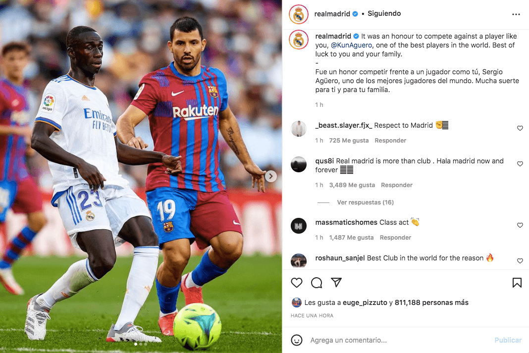"Fue un honor disfrutar de tu futbol vistiendo la rojiblanca. Mucha suerte", firmó el Atlético, mientras el Real Madrid dijo: “Fue un honor competir frente a un jugador como tú, Sergio Agüero, uno de los mejores jugadores del mundo. Mucha suerte para ti y para tu familia”.