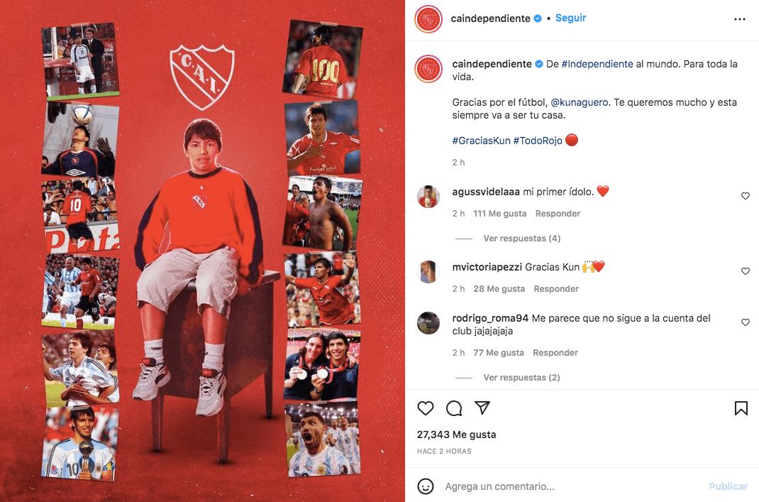 “De Independiente al mundo. Para toda la vida. Gracias por el futbol, ‘Kun’ Agüero. Te queremos mucho y esta siempre va a ser tu casa” escribió el conjunto Rojo con fotos de Sergio Agüero muy joven.