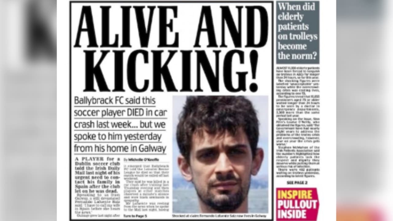 El club de fútbol irlandés Ballybrack FC tuvo que pedir unas humillantes disculpas tras haber anunciado que uno de sus jugadores, el español Fernando Nuno La Fuente, había muerto.