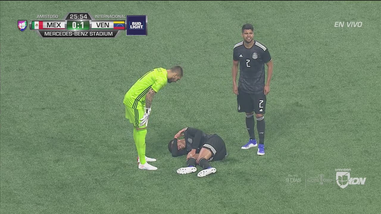 Luego de pelear una pelota con Darwin Machís, el ‘Machín’ se llevó la peor parte al quedarse tendido en el campo de juego con dolor en la pierna. La banca de México se preocupa y ya manda el cambio.