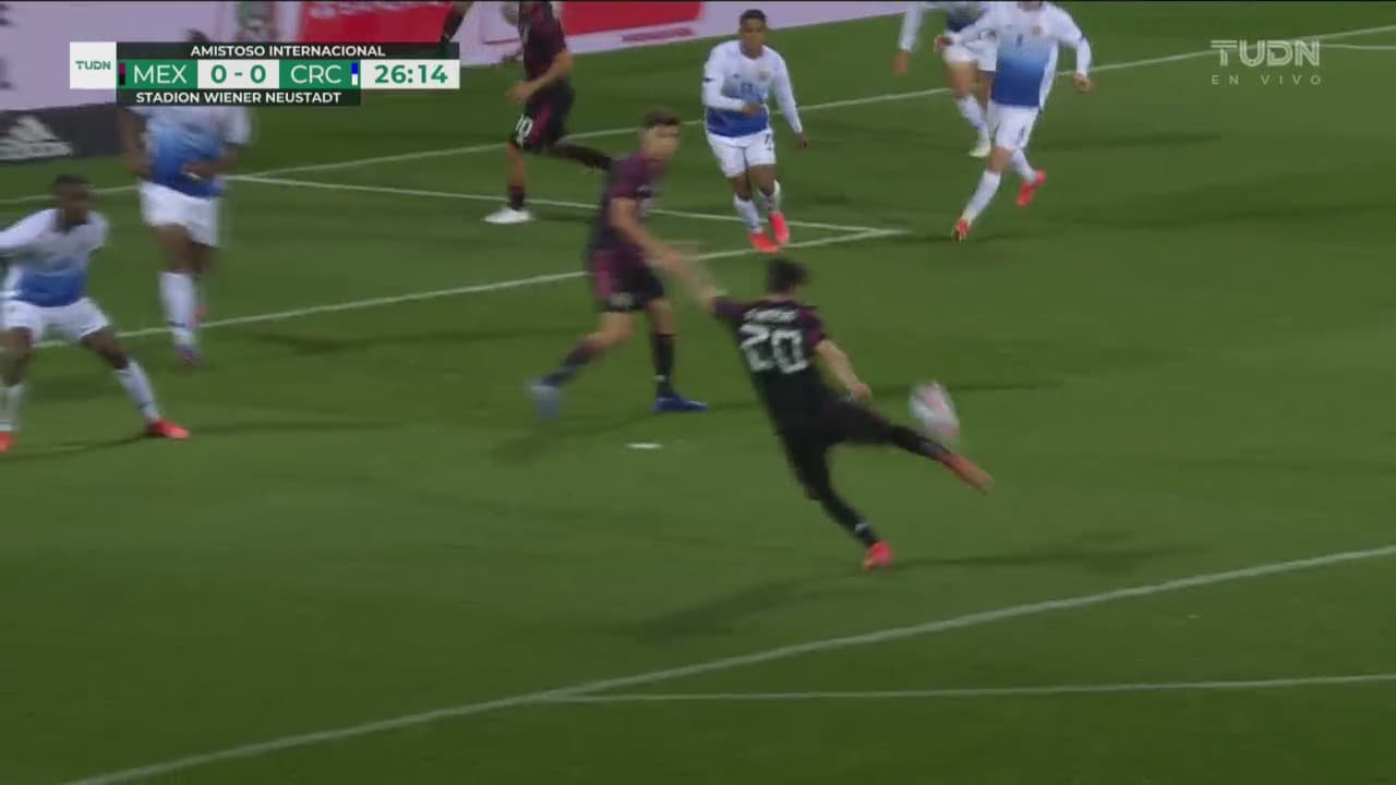 Corona desbordó por la derecha en diagonal retrasada, Gerardo llegó pleno y le pegó desviado al 26’.