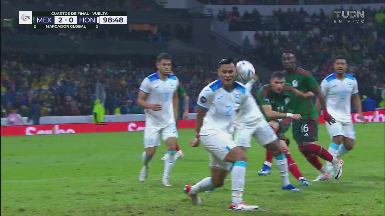 El defensor de Honduras evitó la caída de su meta de forma valiente y acabó tirado en el pasto tras el impacto.