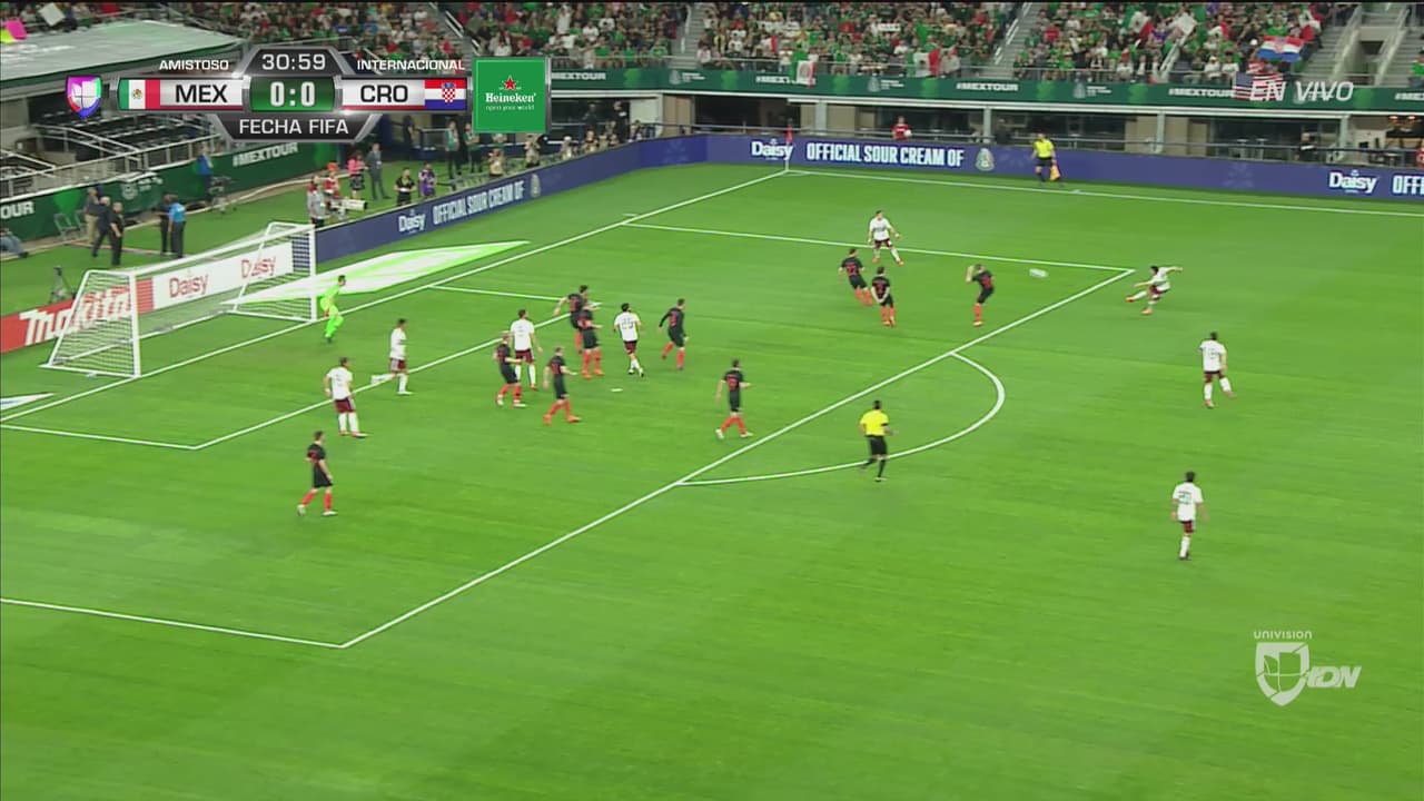 El delantero del Tri pescó el balón tras un tiro de esquina y sacó un remate fuertísimo de pierna derecha que se fue por encima del arco croata.