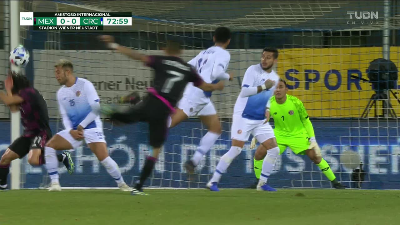Orbelín Pineda (México) remata al travesaño| Disparo con la derecha desde fuera del área. Asistencia de Corona.
