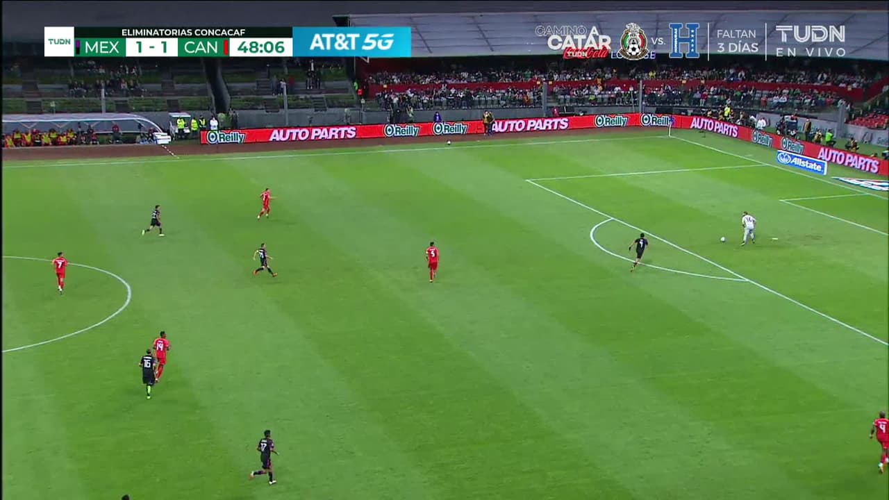 Raúl Jiménez (México) remata al larguero, remate de cabeza desde el lado derecho del interior del área. Asistencia de Jesús Corona con un centro al área tras un saque de esquina.