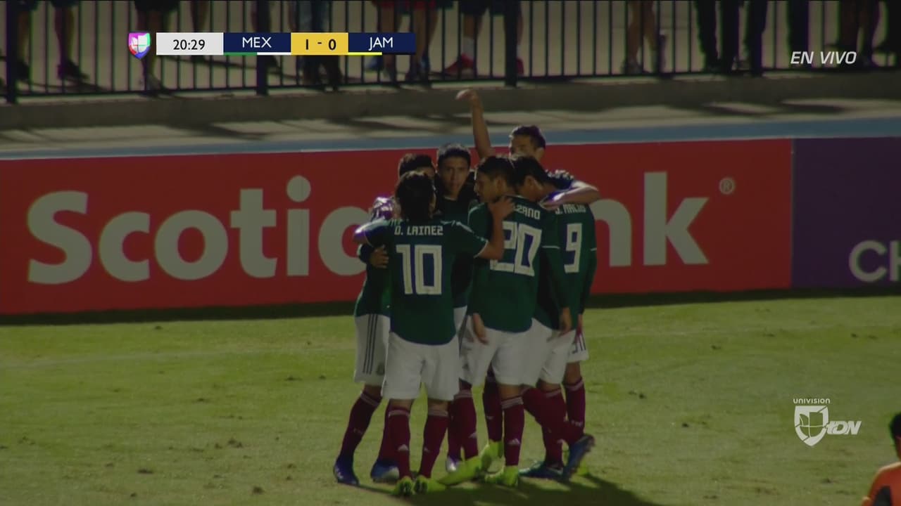 Centro de Diego Lainez para Daniel López que termina siendo empujado a la red por un defensor caribeño.