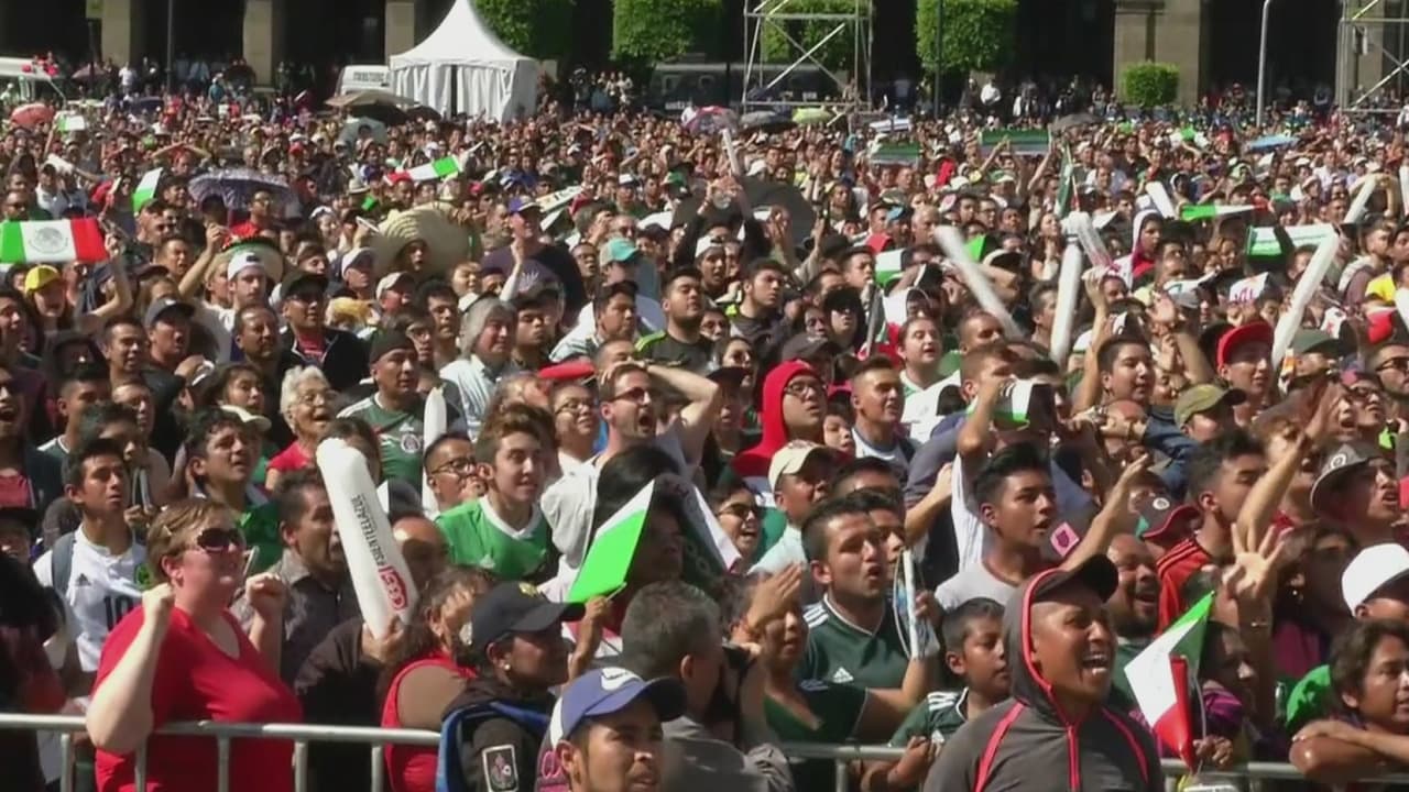Miles de hinchas se dieron cita en la Plaza de la Constitución de CDMX para ver en pantalla gigante el debut del Tri en Rusia 2018. Un gol del ‘Chucky’ Lozano sentenció el partido y desplazó la celebración hacia el Ángel.