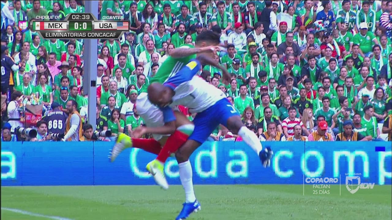 El defensa mexicano peleó un balón por aire con Bobby Woods, extendió el brazo y le dio un codazo al atacante del Team USA. El árbitro se hizo de la vista gorda.