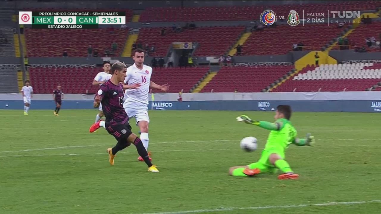Sebastián filtró a Uriel, quien se posó ante el arco de Canadá, pero el portero reaccionó al 24’.