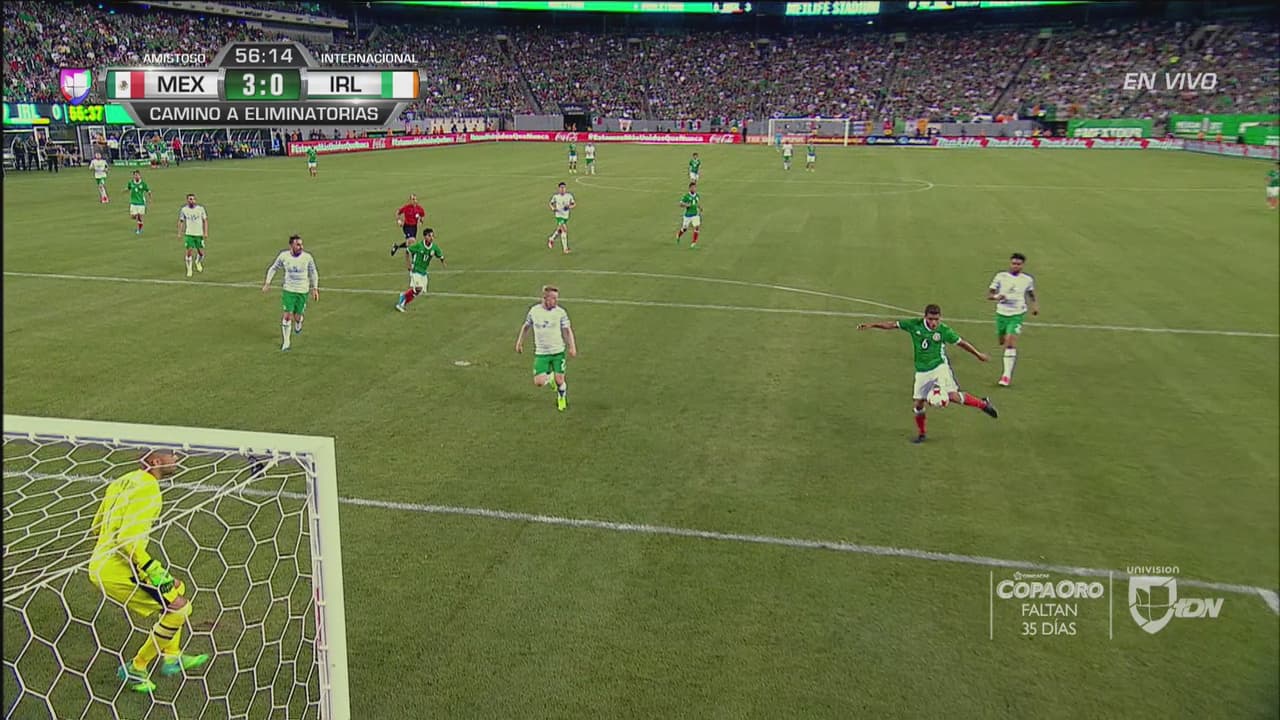 Tras un estupendo servicio de Oribe, el mediocampista del Tri conectó de aire y a punto estuvo de anotar el 4-0.